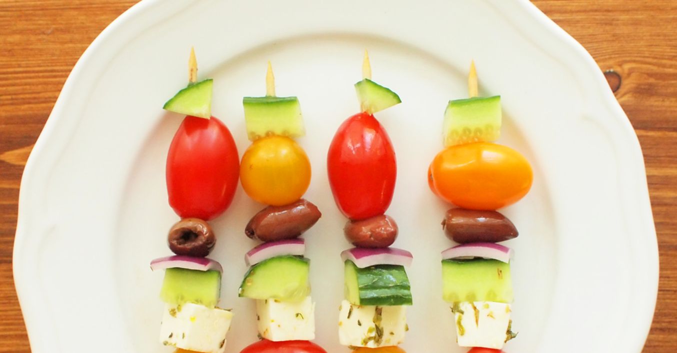Na malé špízky nebo párátka střídavě napíchneme okurku, rajče, fetu, cibuli a olivy.