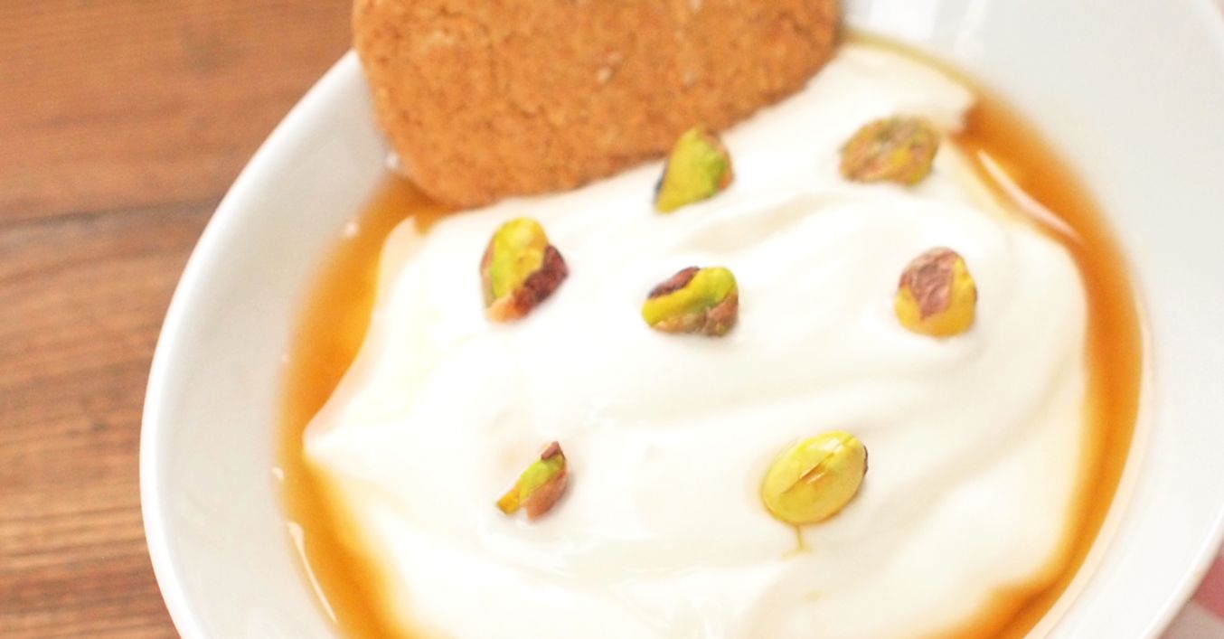 Jogurt rozdělíme do misek, přidáme pistácie a zdobíme medem. Podáváme společně s ovesnými sušenkami.
