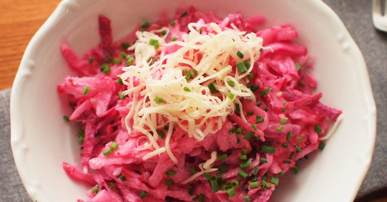 Řepu očistíme a oloupeme. Ředkvičky očistíme a zbavíme nati. Jablko oloupeme a zbavíme jádřince. Vše pak spolu nastrouháme na struhadle do mísy. Křen oloupeme, nastrouháme najemno a také přidáme do mísy.