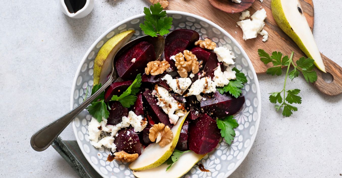 Řepový salát s hruškou, ořechy a balkánským sýrem