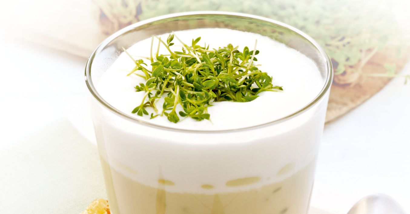 Podáváme do vyšších misek nebo sklenic. Přidáme našlehané ochucené mléko do pěny a zbylou řeřichu. Podáváme.
