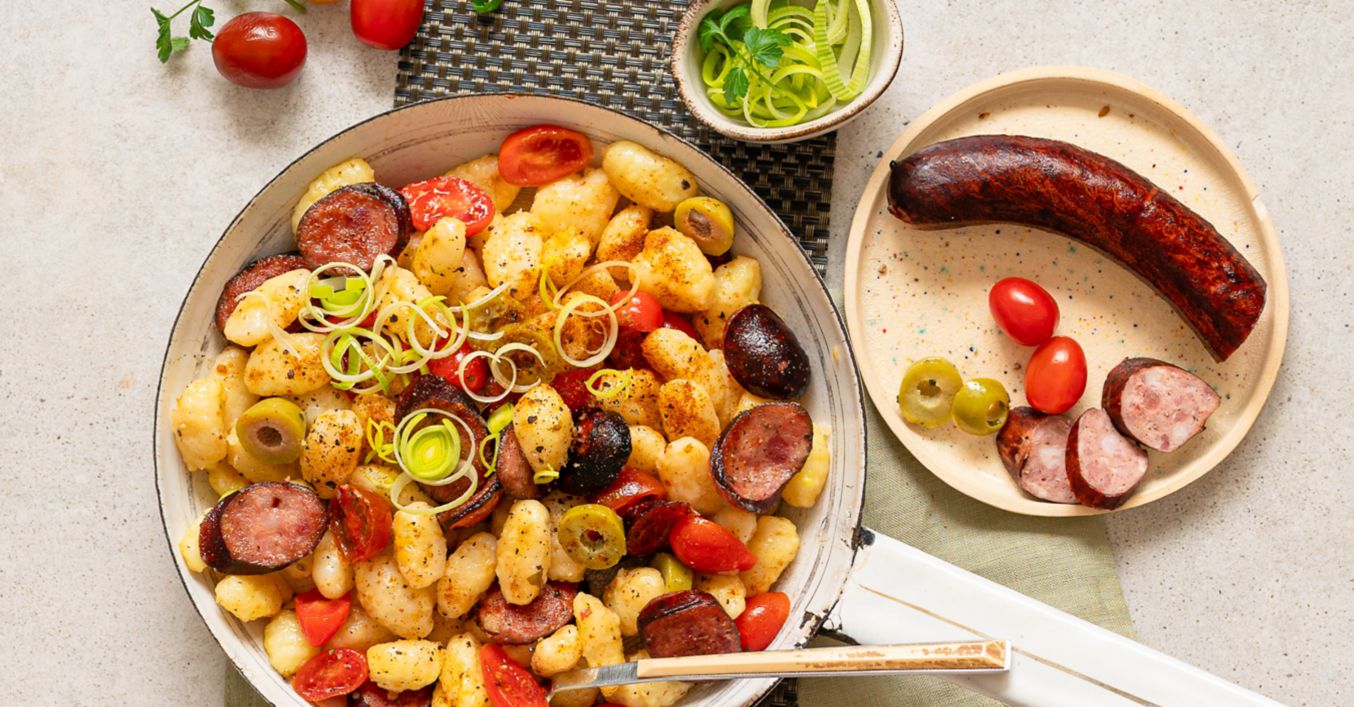 Restované bramborové noky s klobásou a rajčaty