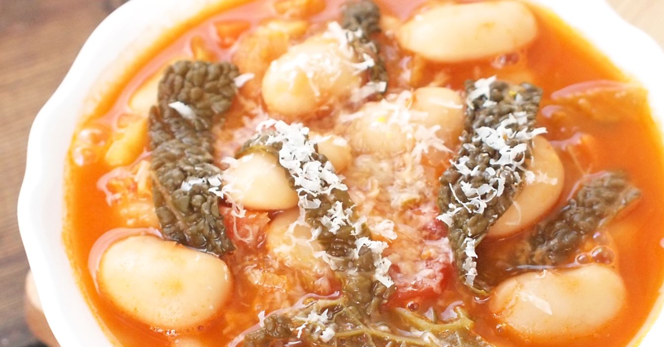 V hrnci rozehřejeme olivový olej, přidáme cibuli, mrkev, česnek a celer a necháme vše opéct dozlatova. Dosolíme a přidáme kostky brambor, rajčata, kapustu a vodu z uvařených fazolí. Podle potřeby doplníme vodou a povaříme asi 30 minut.