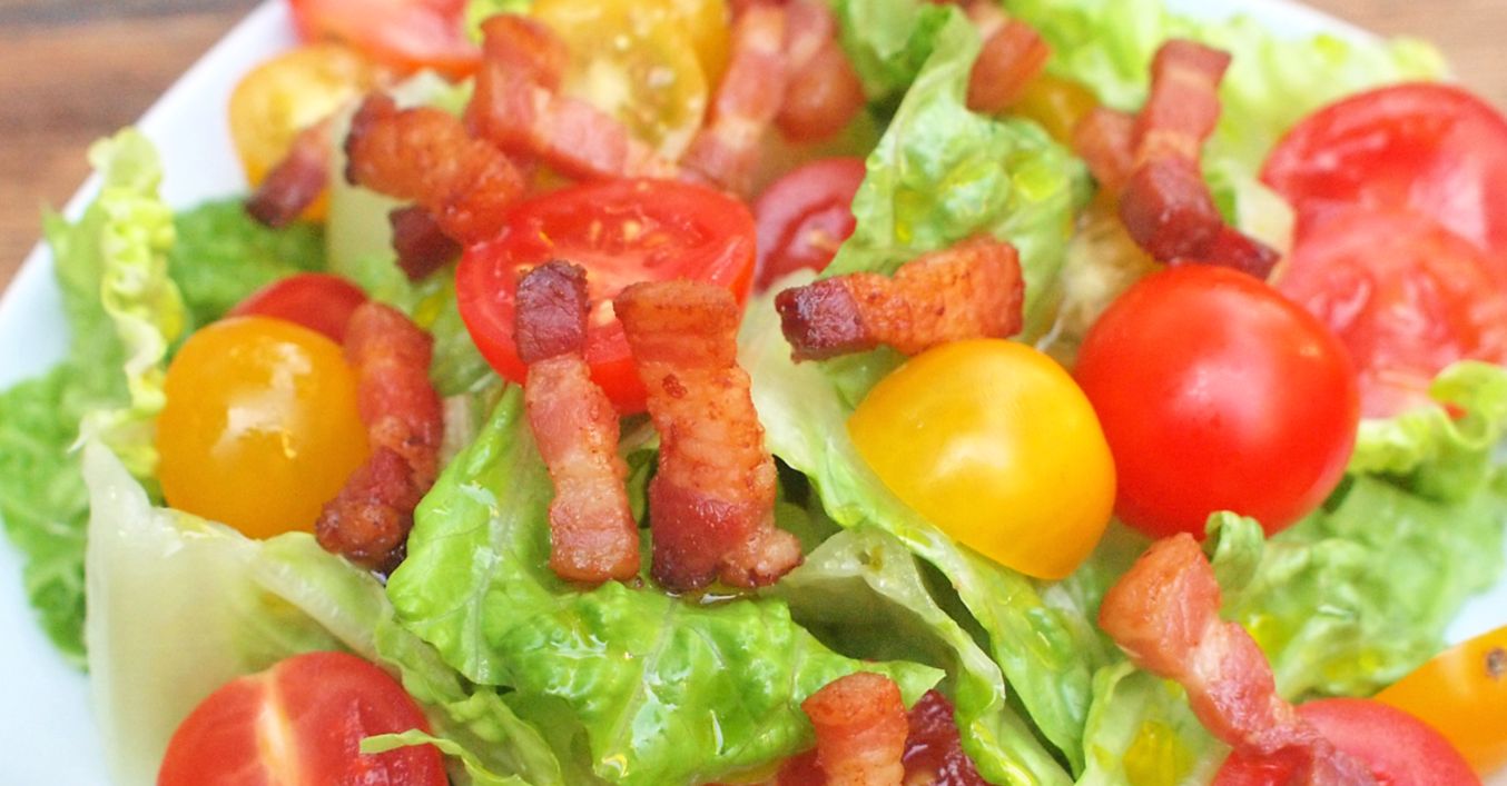 V misce rozmícháme hořčici a ocet. Osolíme, opepříme a postupně metličkou zašleháme olivový olej. V míse smícháme salát se zálivkou, vmícháme rajčata a ihned podáváme se slaninou.