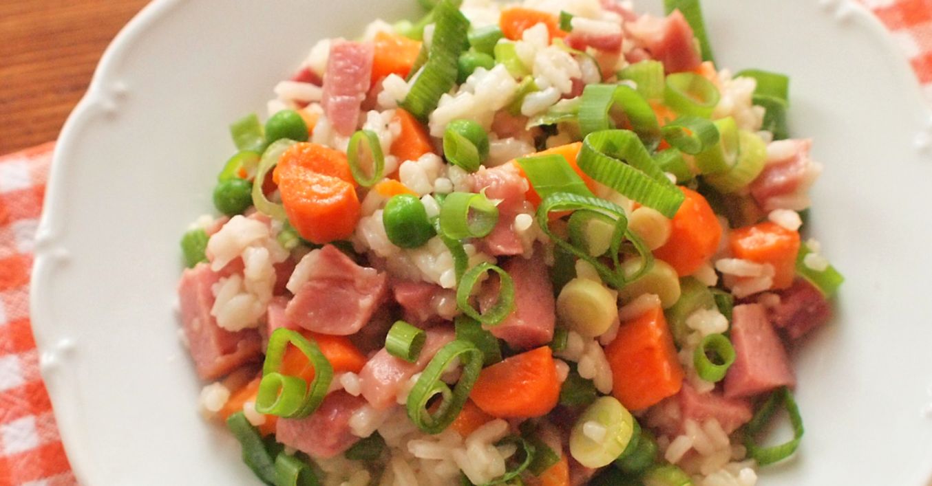 Uvařenou rýži promícháme s mrkví a jarní cibulkou, uzeným kolenem a strouhaným sýrem. Promísíme a ihned podáváme.