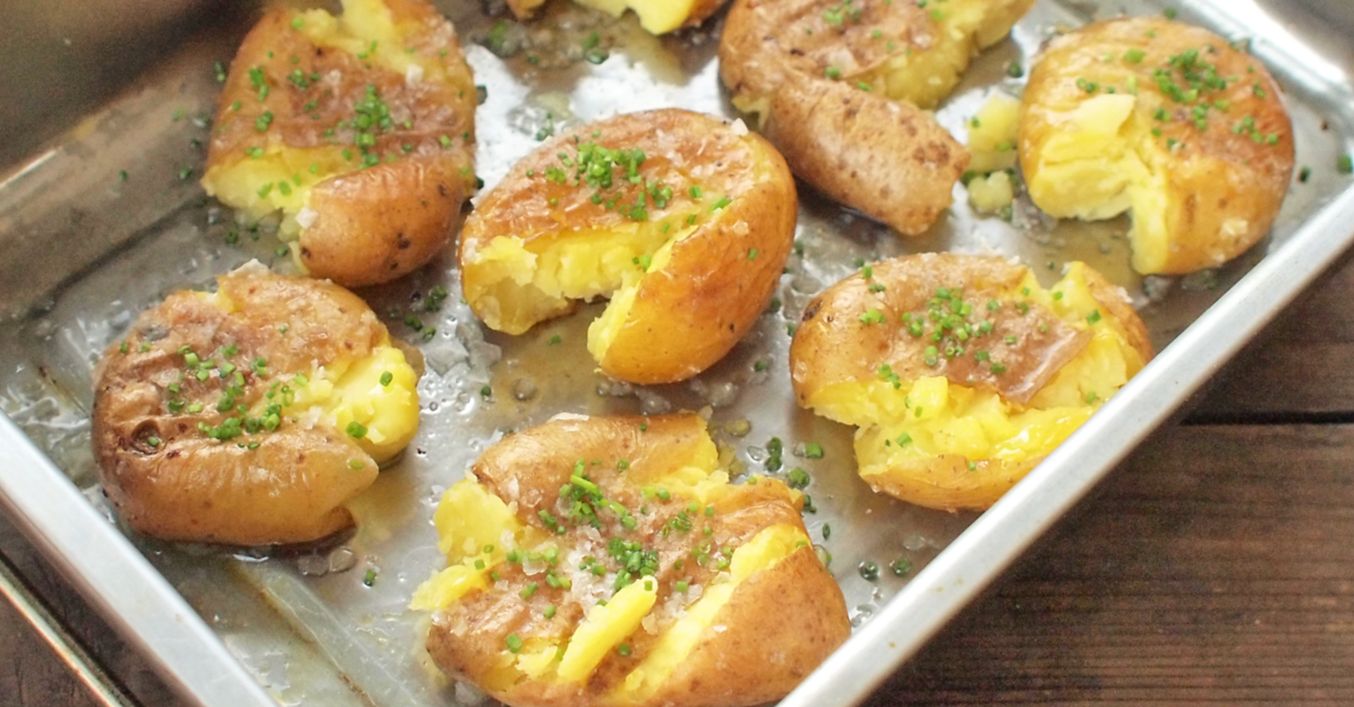 Upečené brambory rozdrtíme vidličkou a přendáme na talíř. K bramborám podáváme pažitkové máslo, které nakrájíme na plátky. Dochutíme mořskou solí.