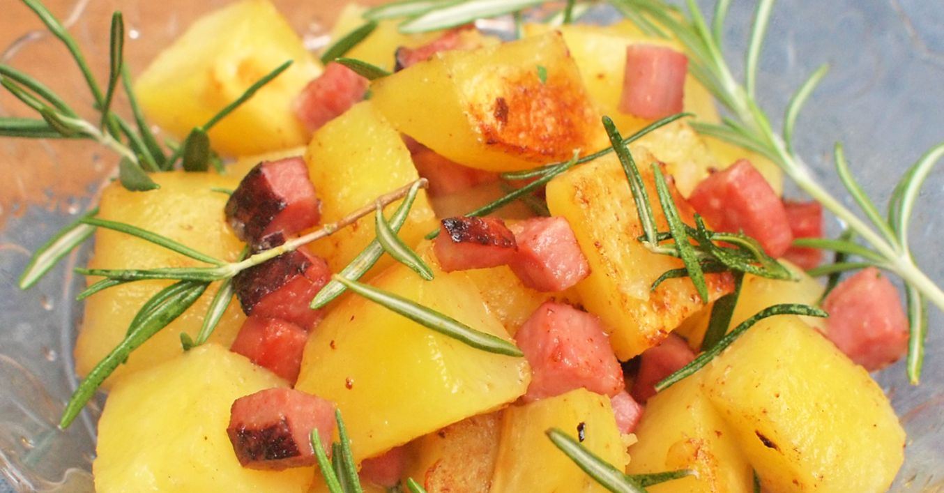 V pekáči smícháme brambory se sádlem. Přidáme uzené maso, rozmarýn a vše dobře osolíme a opepříme.