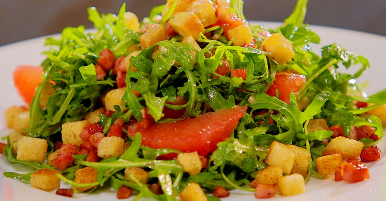 Rukolový salát se slaninou, krutony a grepem