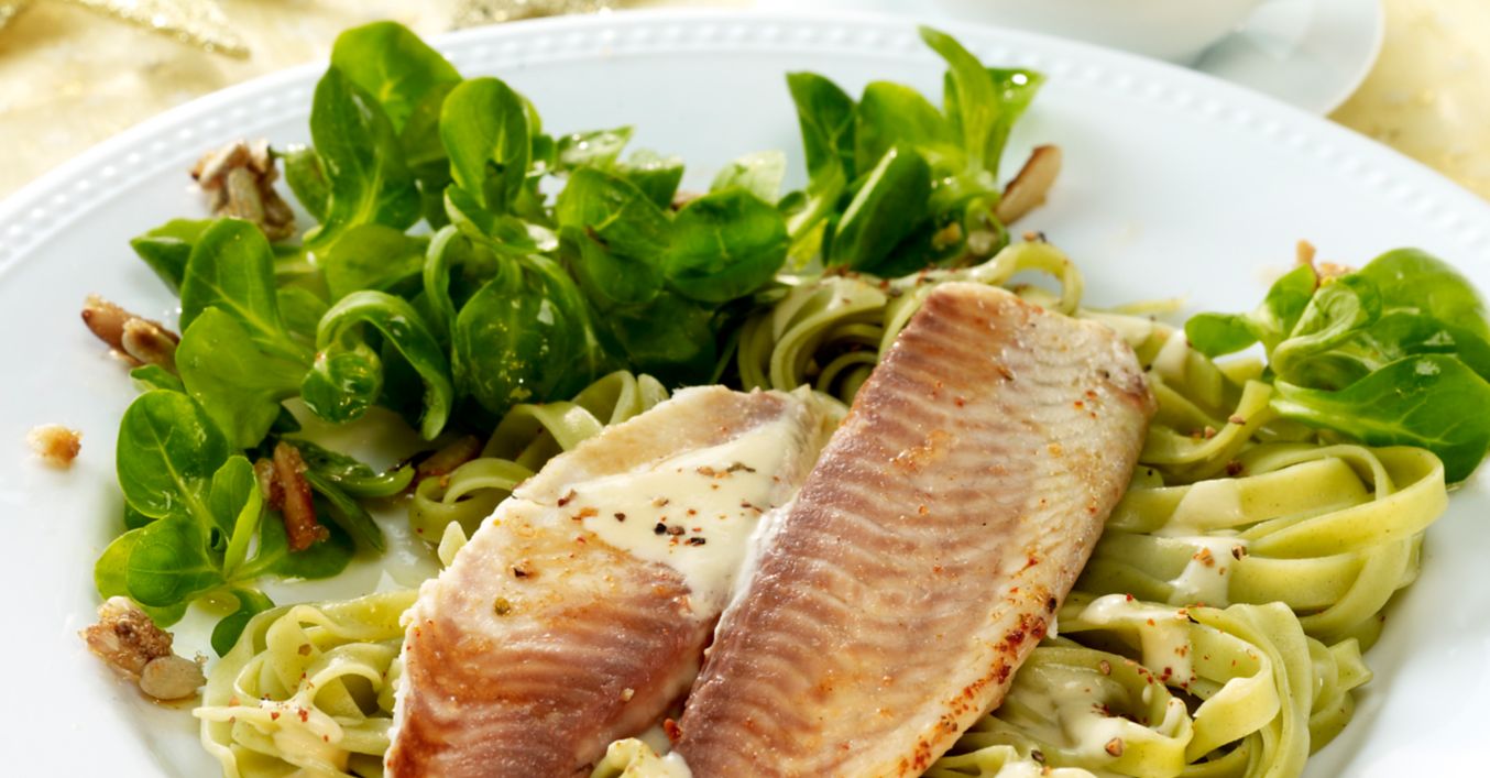 Rybí filé podáváme s těstovinami, hořčičnou omáčkou a salátem, který dozdobíme karamelizovanými semínky.