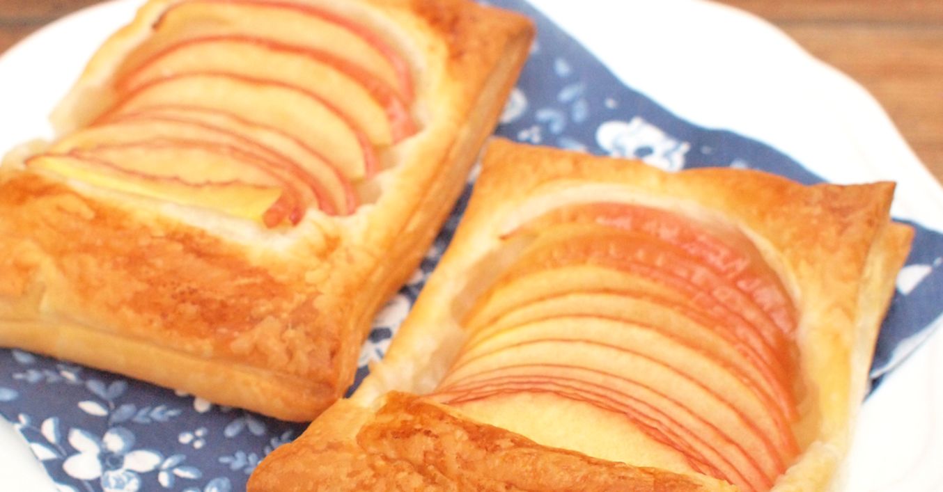 Každý plát těsta potřeme rozpuštěným máslem. Asi 1 cm k okraji těsta necháme vždy nepotřený. Poté přidáme jablka a znovu potřeme zbylým máslem.