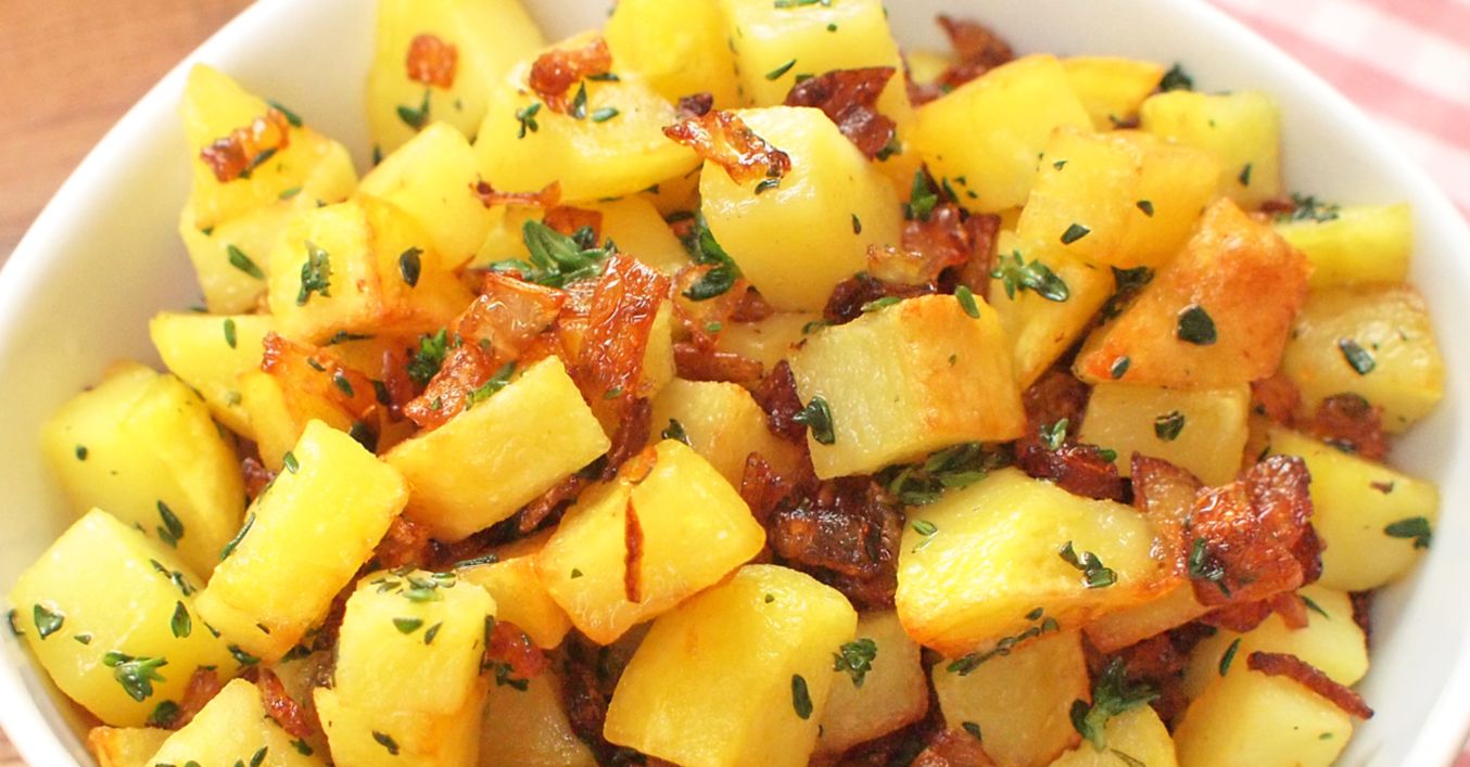 Hotové brambory zbavíme tuku a dáme do mísy. Promícháme spolu s tymiánem a osmaženou cibulkou.