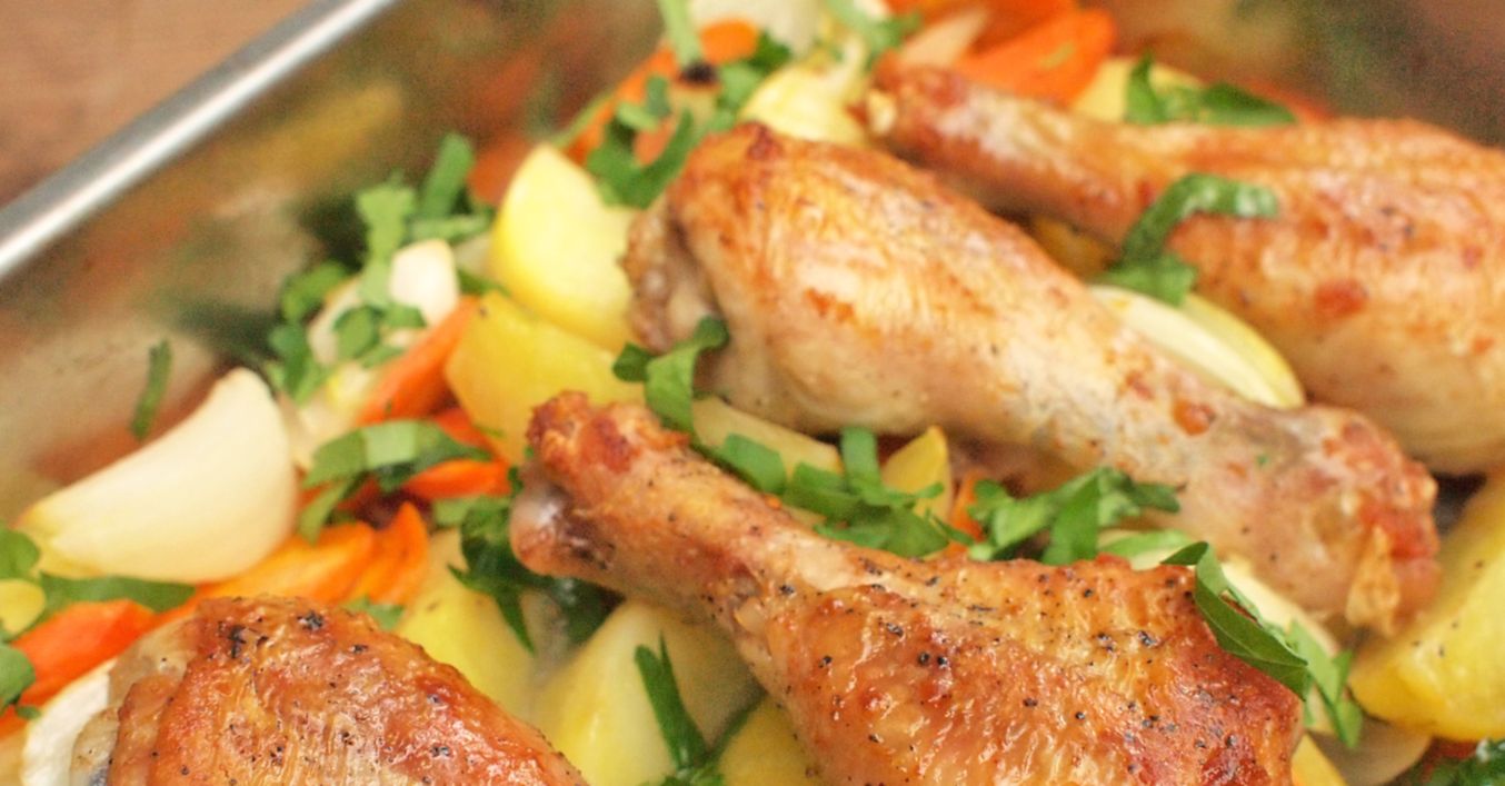 Kuřecí stehna rozdělíme v kloubu na polovinu a ze všech stran je potřeme kořenící směsí. Brambory oloupeme a nakrájíme na čtvrtiny. Mrkev oloupeme a nakrájíme na šikmé tenké plátky. Cibuli oloupeme a podélně nakrájíme na čtvrtinky.