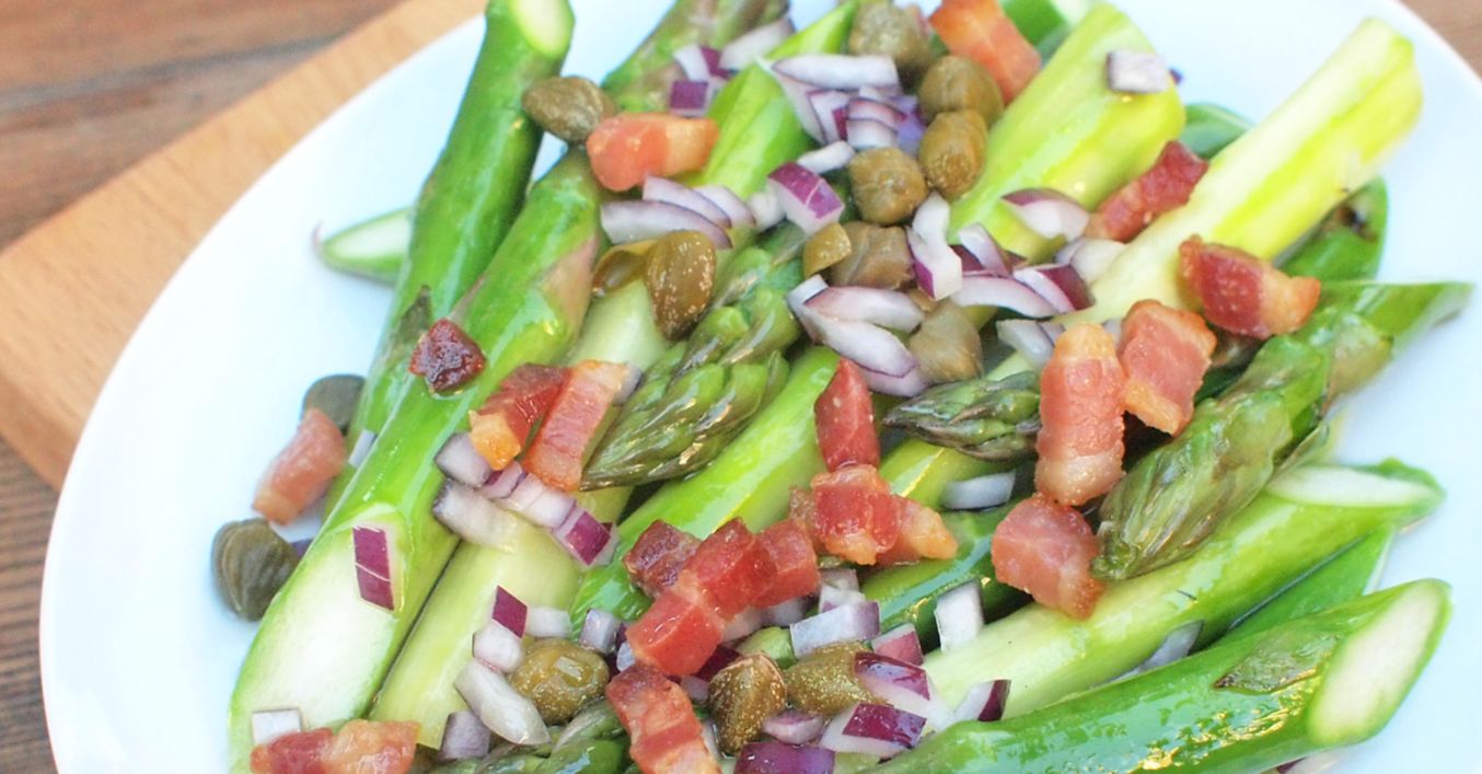 Chřest očistíme, zbavíme konců a v dolní třetině oloupeme. Poté jej nakrájíme na poloviny nebo u delšího chřestu na třetiny. V pánvi rozehřejeme máslo, přidáme chřest a krátce jej orestujeme (asi 3 minuty). Osolíme, opepříme a podáváme společně se zálivkou, nadrobno nasekanou šalotkou, kostičkami slaniny a kaparami.