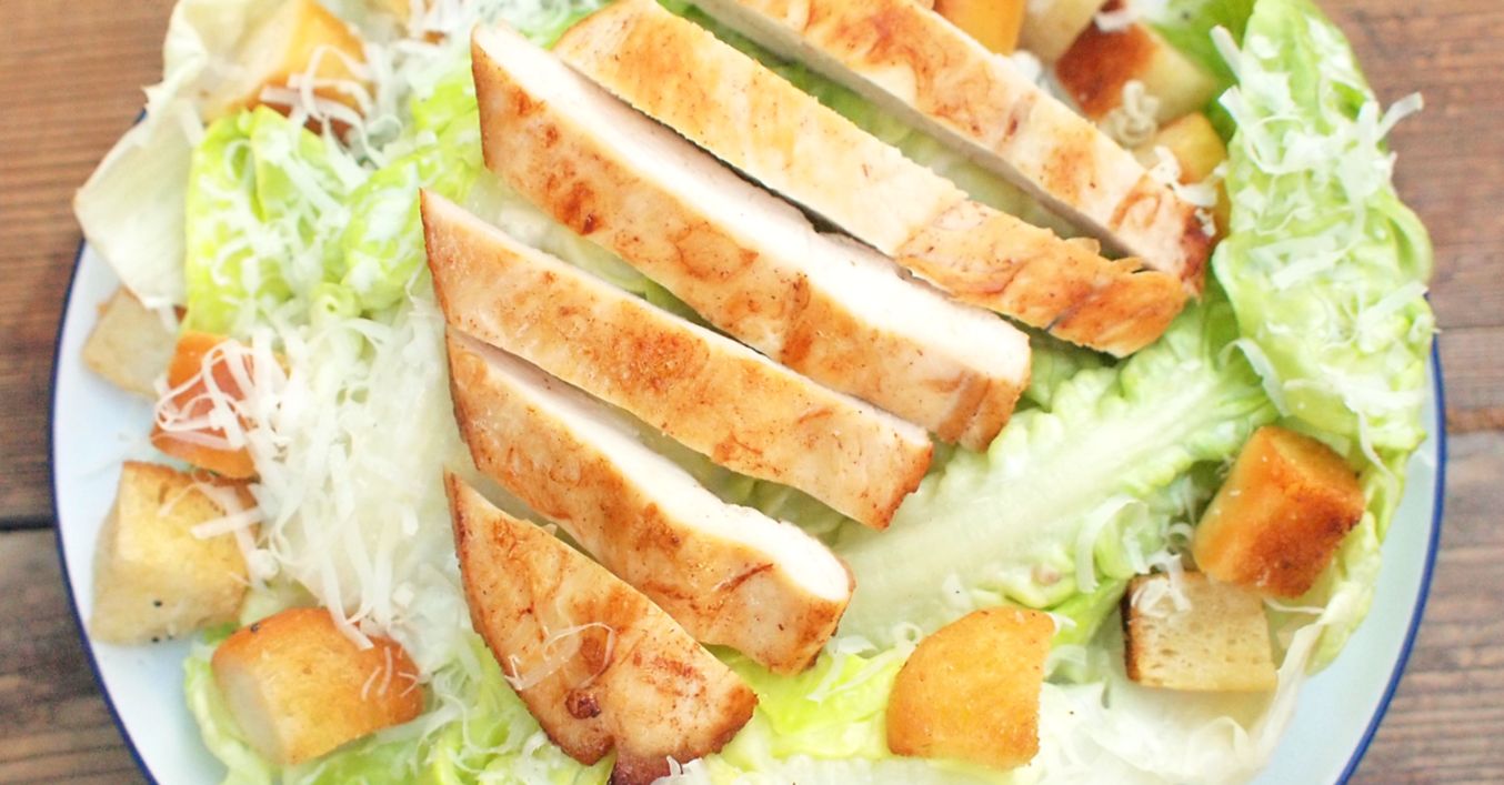 Na zbylé lžíci oleje osmažíme nakrájenou žemli dozlatova a zbavíme tuku na ubrousku. V míse důkladně promícháme salát se zálivkou a podáváme spolu s krutony a nakrájeným kuřecím masem.