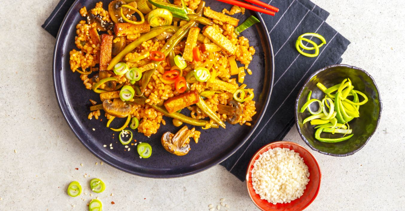 Rýže s marinovanými tofu nudličkami