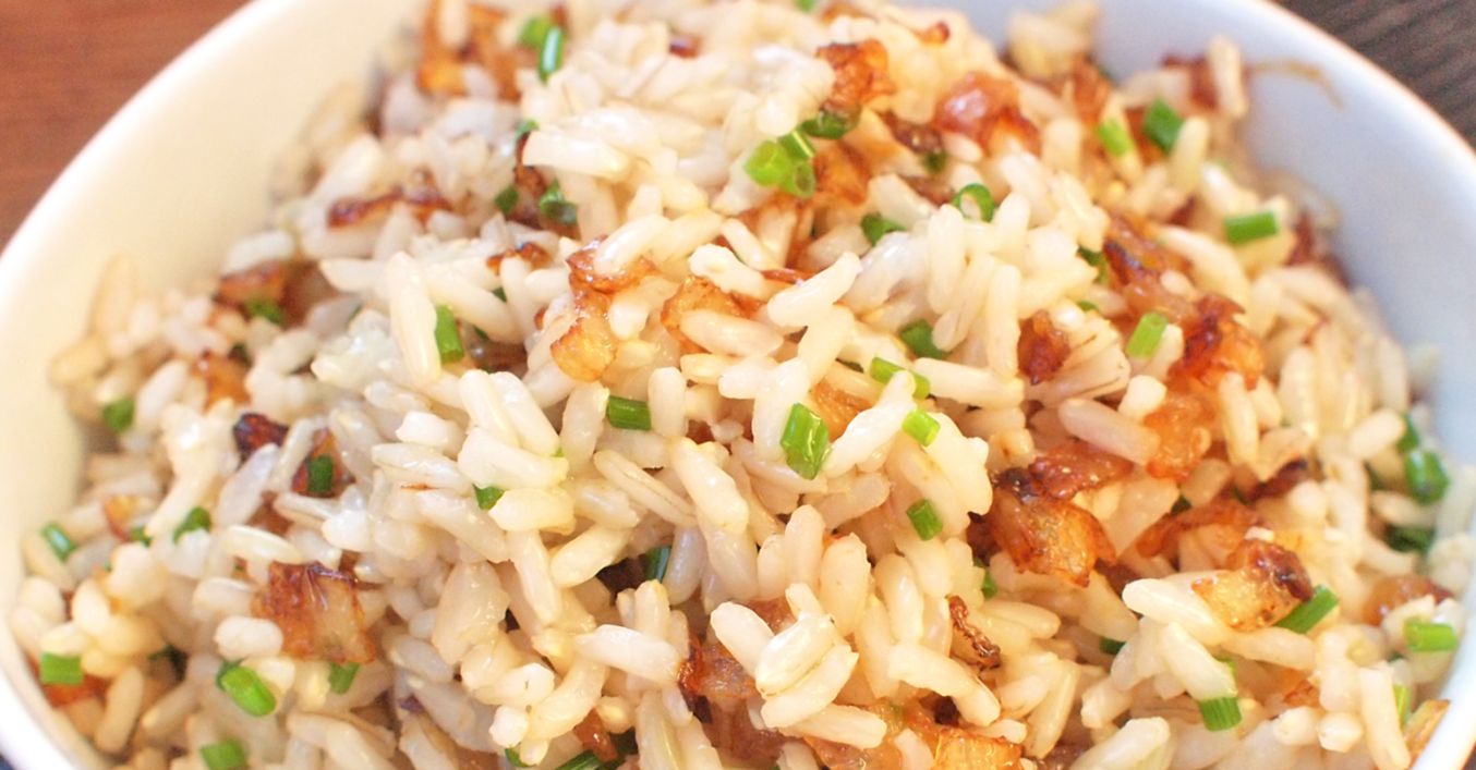 Cibuli oloupeme a nakrájíme nadrobno. V pánvi rozehřejeme olej, přidáme cibuli a na středním plameni restujeme dozlatova. Část oleje slijeme. Cibulku proomícháme s rýží, pažitkou a podáváme.