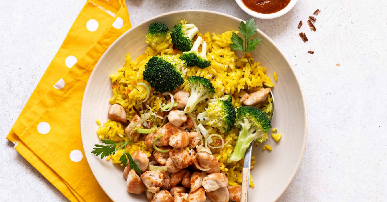 Uvařenou rýži podávejte s orestovaným kuřecím masem a brokolicí.