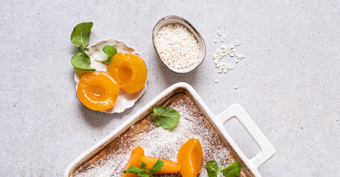 Žloutkovou pěnu promíchejte s vychladnou rýží a jednou polovinu sněhu z bílků. Polovinu směsi rozprostřete do pekáčku vymazaného máslem. Rozložte půlky kompotovaných meruněk a na dejte druhou polovinu rýžové směsi. Nahoru rozetřete zbylý sníh. Pečte cca hodinu v troubě vyhřáté na 180 °C.