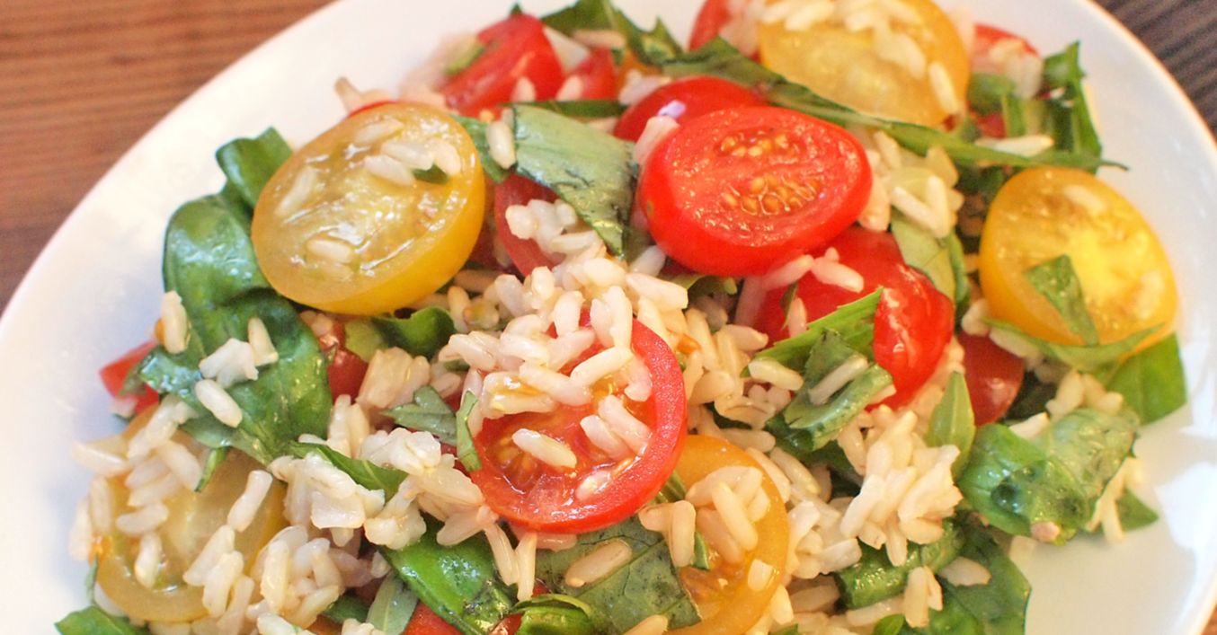 Rajčata očistíme, osušíme a rozpůlíme. Bazalku očistíme, rozebereme na lístky a nahrubo nasekáme. V míse promícháme rajčata, bazalku, olivový olej a ocet. Vmícháme scezenou rýži, promícháme a dochutíme solí a pepřem.