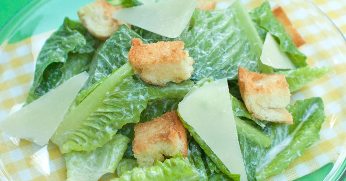 Ve velké salátové míse spolu smícháme natrhané kusy salátu s hotovým dresinkem. Servírujeme na talíř spolu s krutony a hoblinami parmazánu.