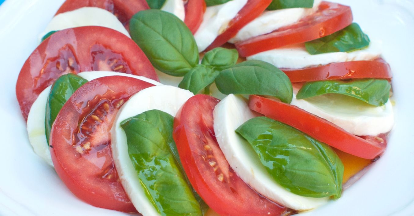 Klademe střídavě plátky sýra a rajčete po obvodu talíře. Na konci salát osolíme a opepříme. Ozdobíme lístky čerstvé bazalky a zakápneme trochou olivového oleje.