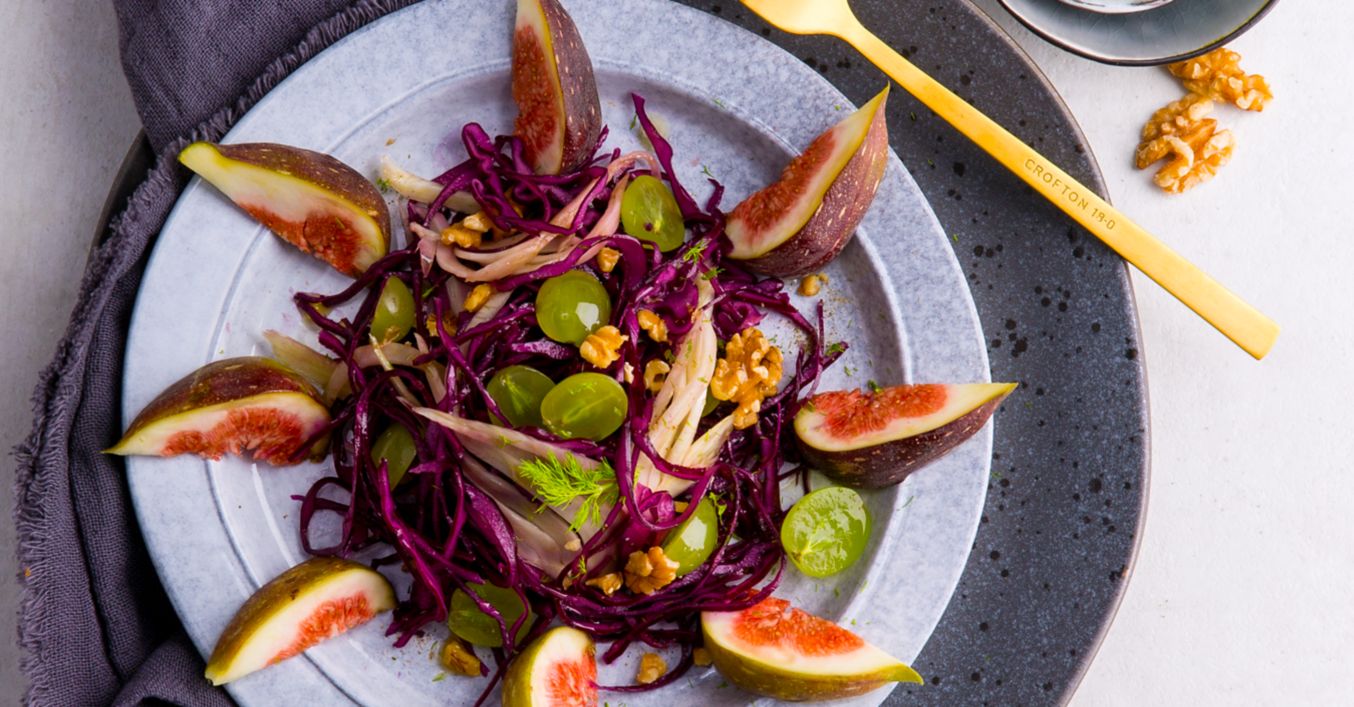 Smíchejte hrozny a zelí s fenyklem a položte na talíře mezi fíky. Posypejte vlašskými ořechy.