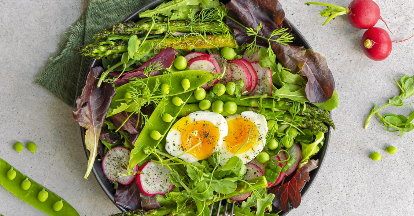 Salát s grilovaným chřestem, ředkvičkami, hráškem a vejcem