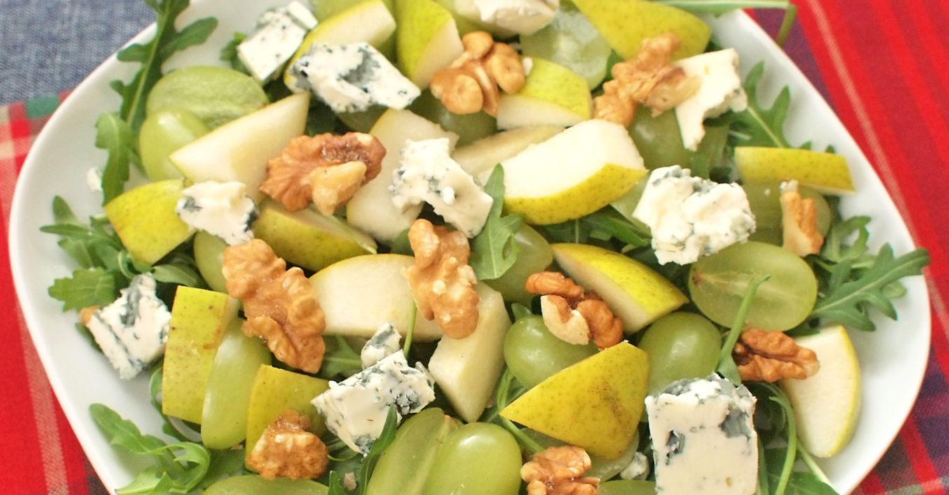 Na talíře postupně aranžujeme hroznové víno, hrušky, rukolu, sýr a vlašské ořechy. Velmi lehce zakápneme citronovou šťávou a olivovým olejem.
