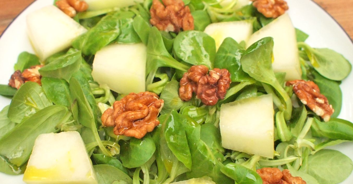 V míse smícháme polníček se zálivkou. Rozdělíme na porce, ozdobíme melounem a ořechy a ihned podáváme.