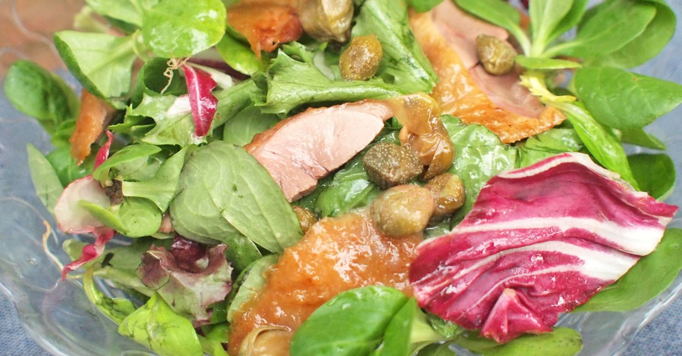 Ve velké míse smícháme polníček, čekanku, salát a zálivku. Přidáme kousky kachního masa a podáváme.