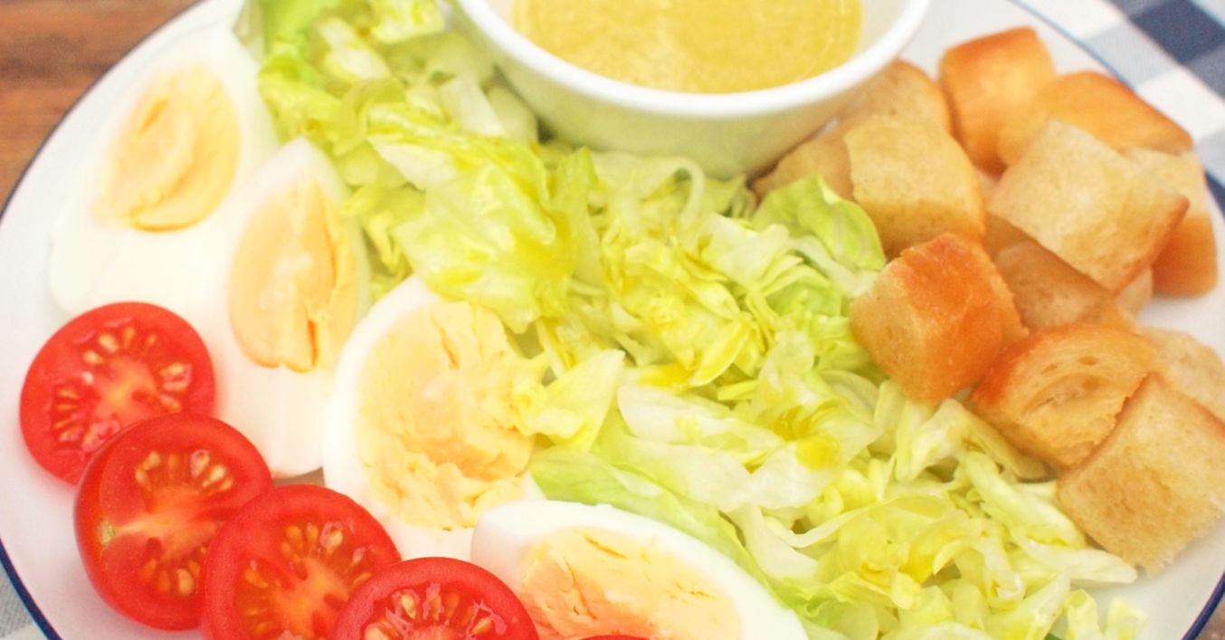 Na talíř rozdělíme rajčata, nakrájená vejce, salát a krutony. Zálivku dáme stranou do misky a společně podáváme.