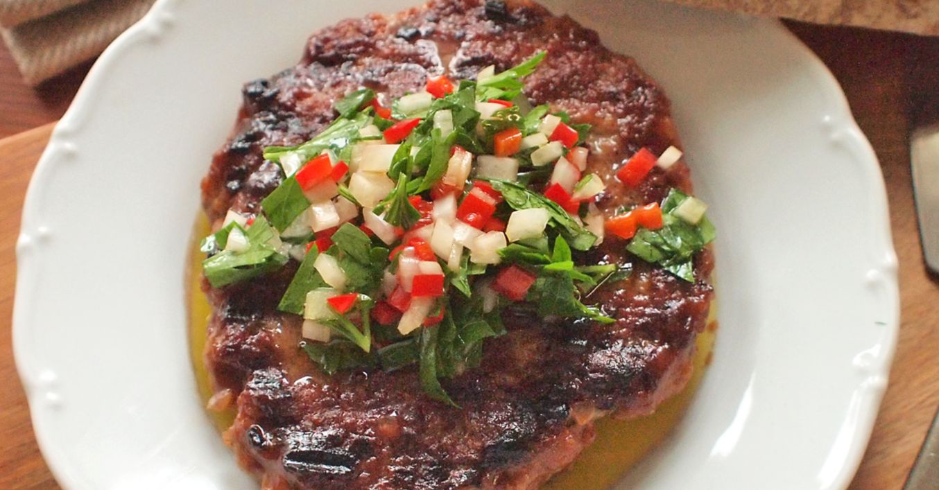 V nepřilnavé pánvi rozehřejeme olej a připravené steaky na něm opečeme z obou stran (dohromady asi 12 až 16 minut). Zdobíme pikantní salskou a podáváme.
