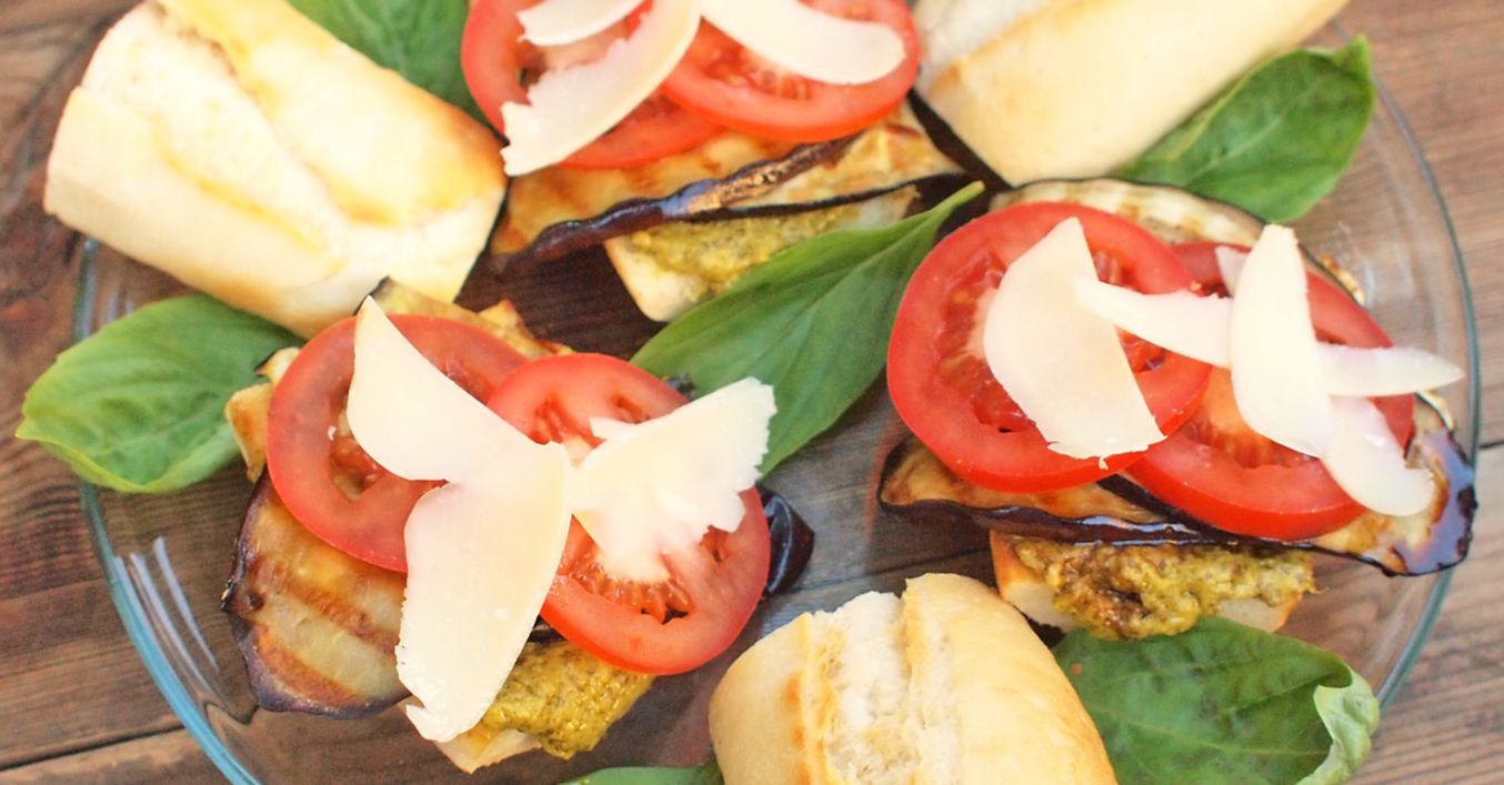 Grilované plátky bagety potřeme pestem, nandáme lilek, plátky rajčat a zakápneme aceto balsamico a zbylým olivovým olejem. Přidáme parmazán, osolíme a opepříme.
