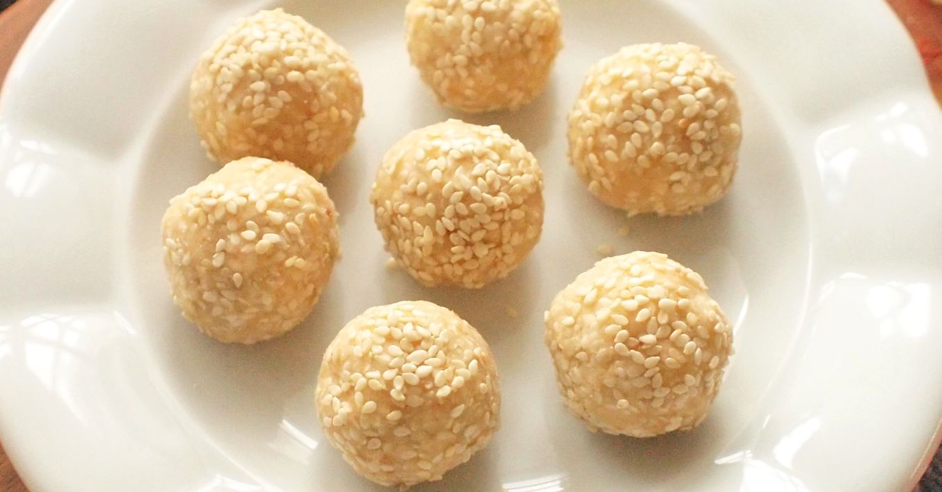 Připravenou hmotu tvarujeme do kuliček, které obalíme v sezamu.
