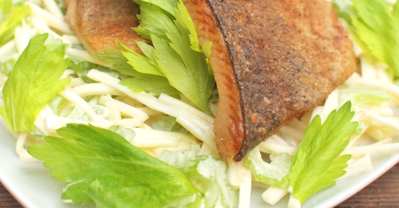 V pánvi si rozehřejeme olej s máslem. Postupně přidáváme díly ryby, které opékáme z obou stran dozlatova. Opečené díly ryby zbavíme přebytečného tuku na papírovém ubrousku a ihned podáváme s odleželým celerovým salátem.