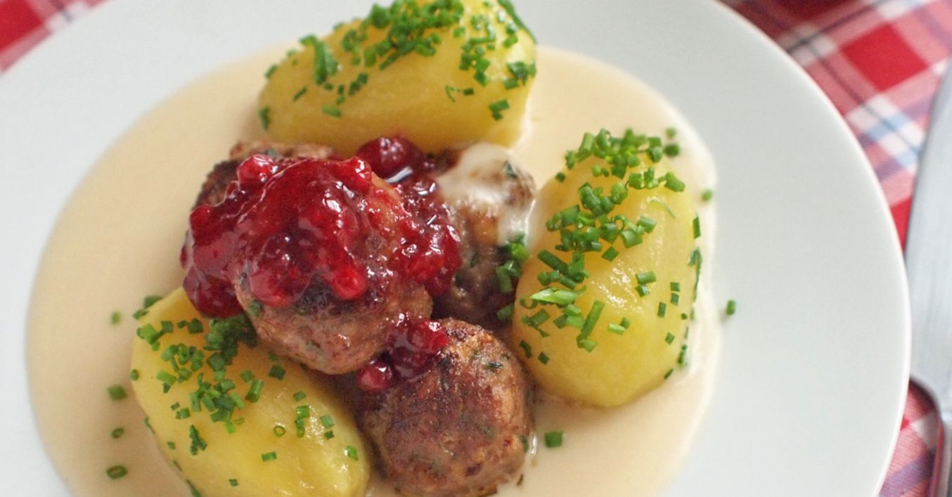Hotové kuličky podáváme s bramborami zalitými omáčkou. Každý talíř ozdobíme brusinkovou omáčkou.