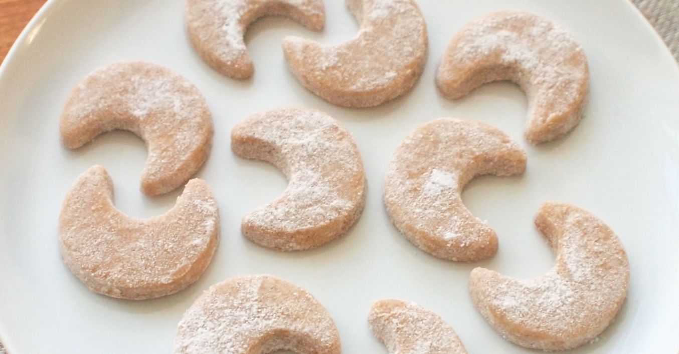Těsto zabalíme do fólie a necháme chvíli odležet v lednici. Poté ho vyválíme na plát silný asi 0,5 cm, ze kterého vykrajujeme vykrajovátkem měsíčky.
