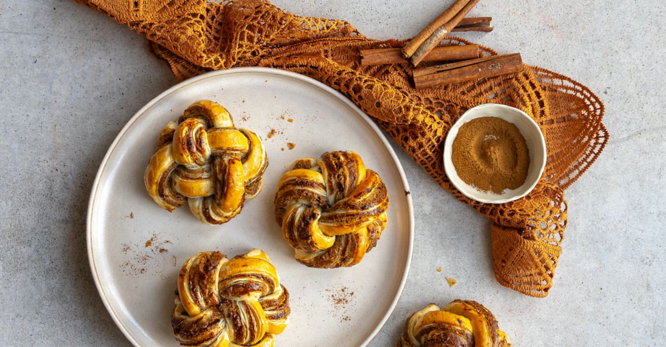 Smíchejte máslo, cukr a skořici. Rozprostřete na rozválené těsto.