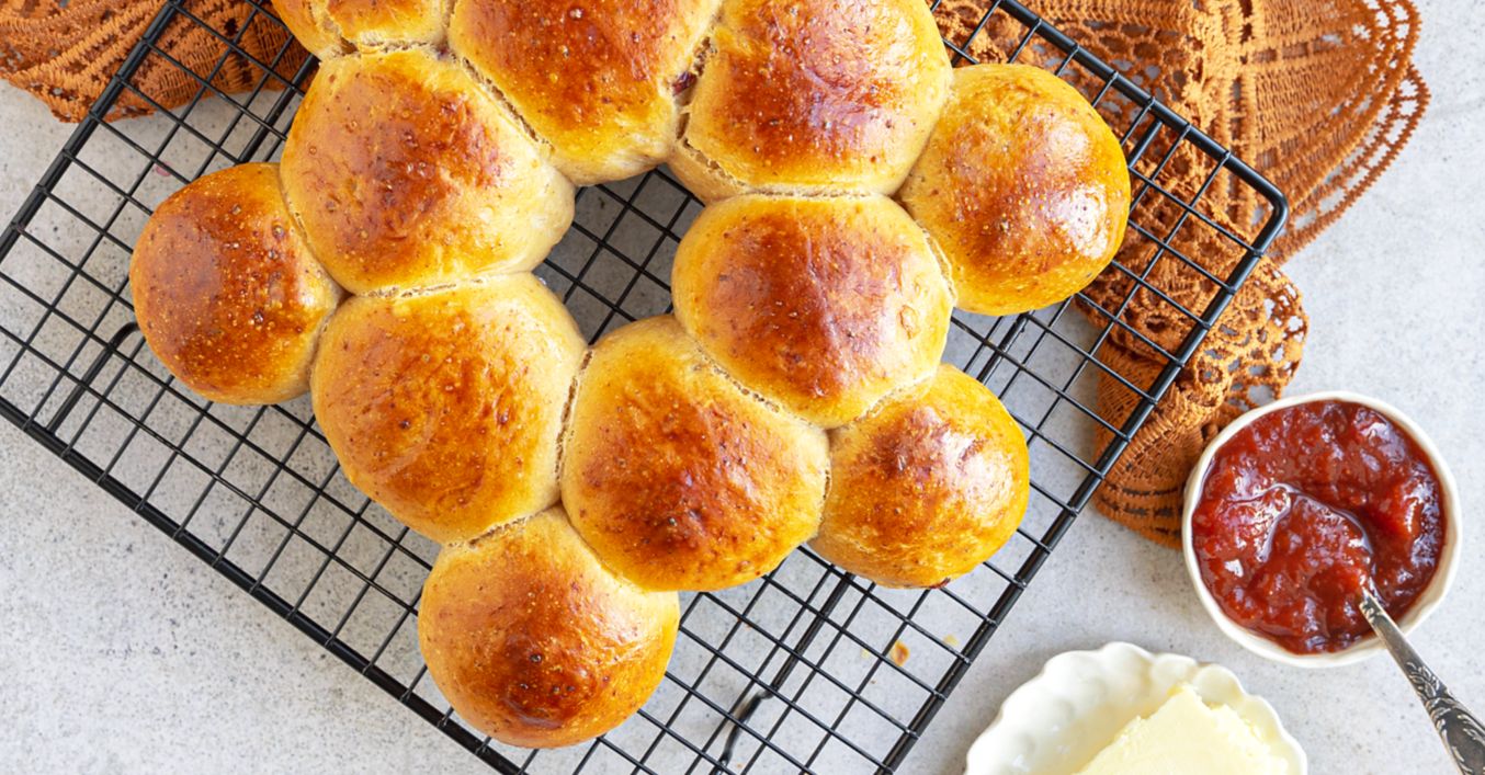 Vykynuté těsto rozdělte na 12 stejně velkých dílů. Všechny je vytvarujte do kuličky, které dávejte do tvaru kruhu na plech vyložený pečícím papírem. Poté je zakryjte utěrkou a nechte kynout dalších 30 minut.