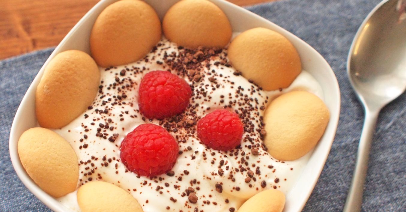 Do misek rozdělíme piškoty, přidáme vrstvu zakysané smetany a na ni vrstvu šlehačky. Přidáme ovoce, ozdobíme grankem a podáváme.