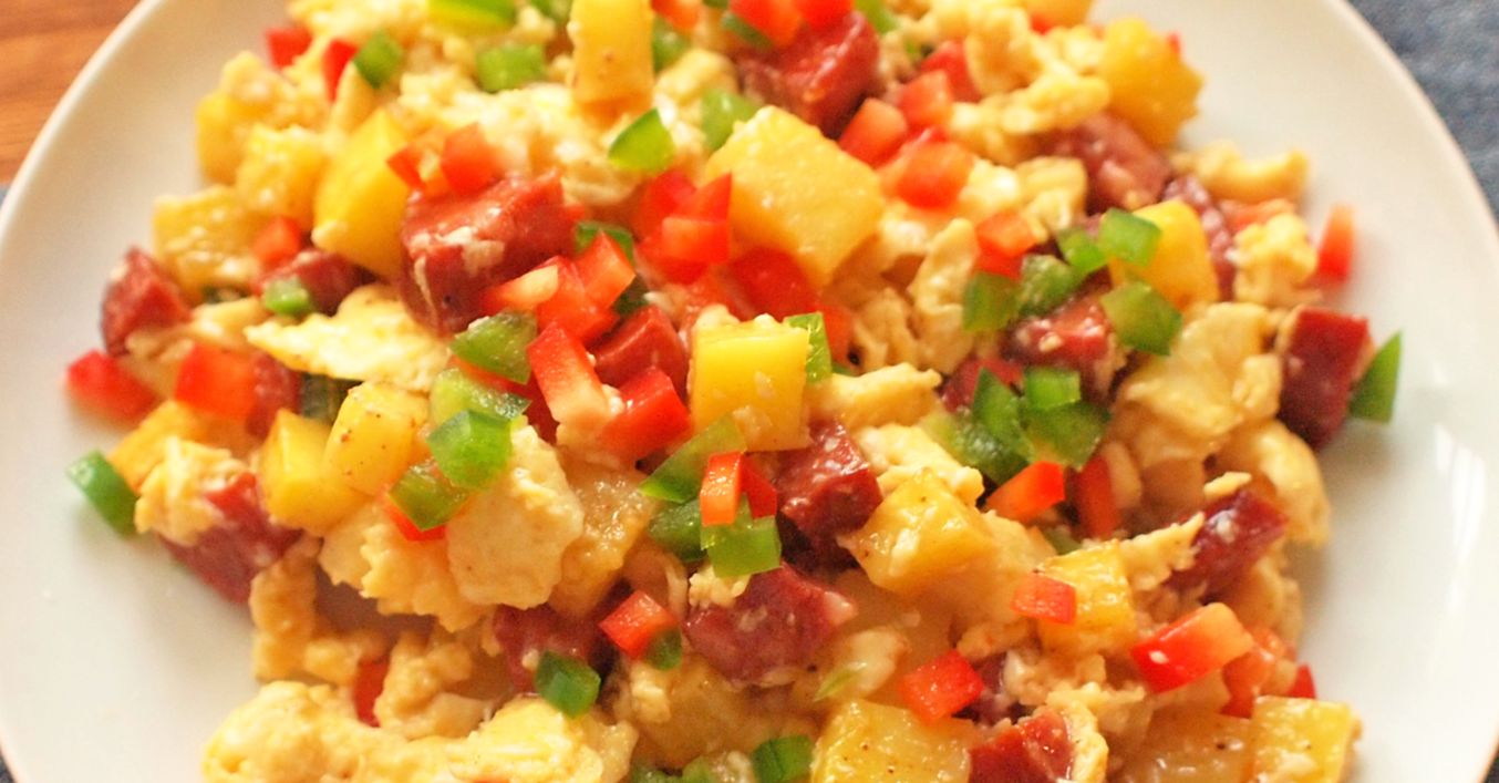 Smažená vejce s brambůrky a klobásou