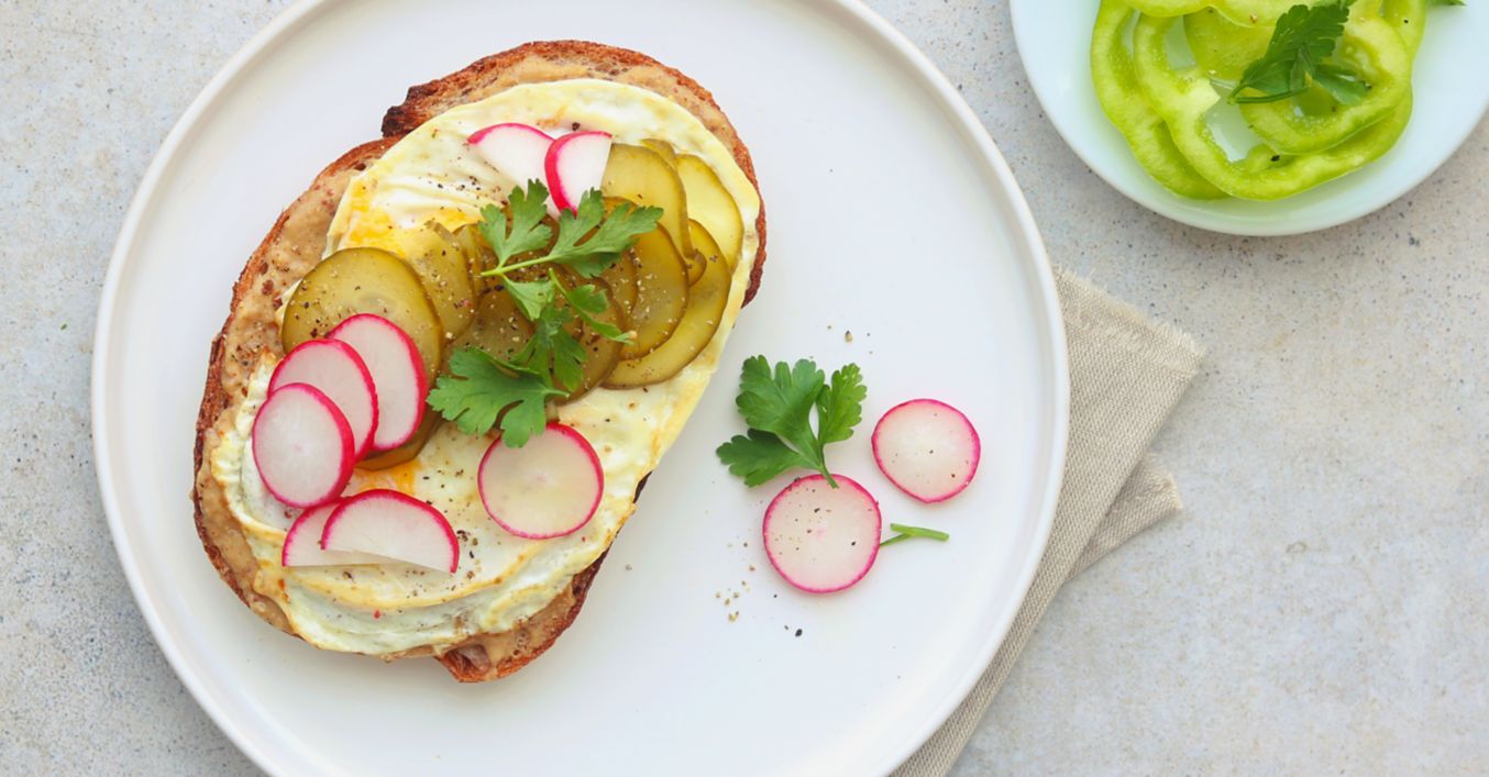 Chléb potřete hořčicí. Pak obložte vaječnou omeletou, nakrájenými ředkvičkami a čerstvou petrželkou.