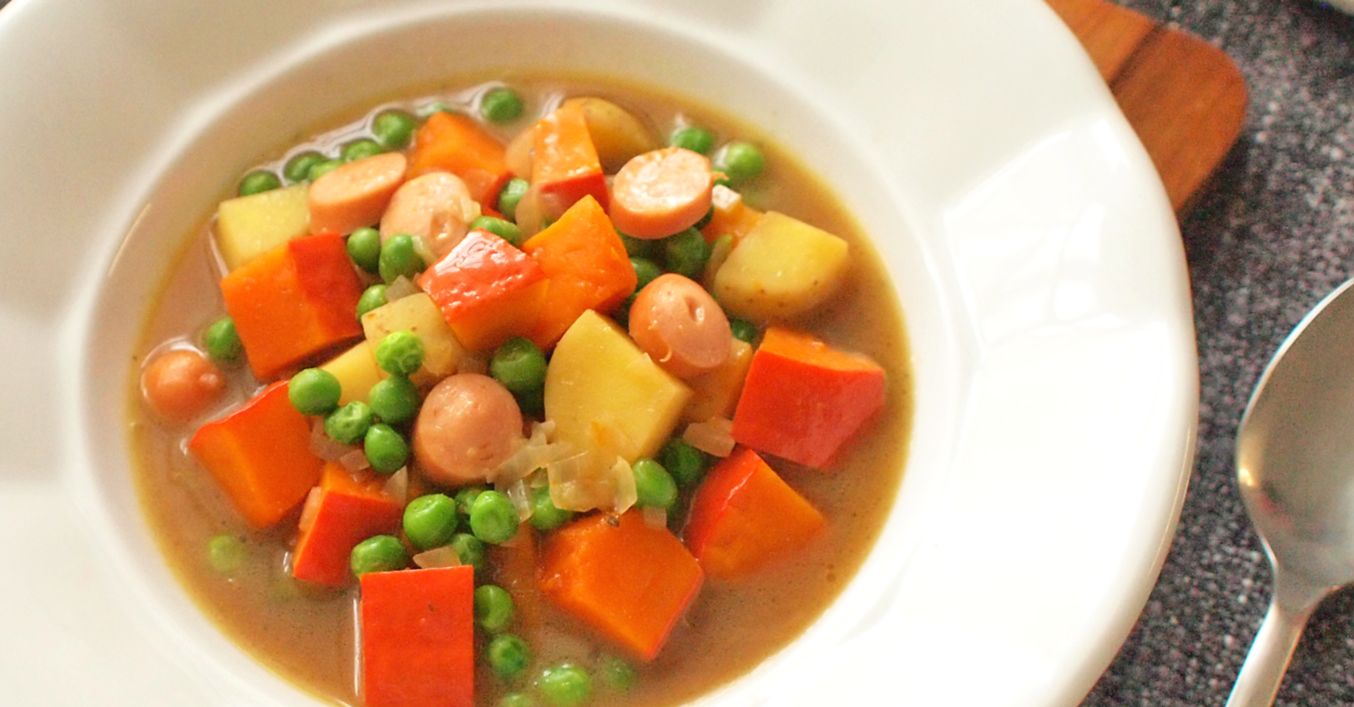 Zaprášíme moukou, promícháme a krátce orestujeme. Přidáme vývar, brambory, hrášek, párek, pár kuliček nového koření, bobkový list a přivedeme k mírnému varu. Společně dusíme do změknutí a dokud se nevyvaří většina vývaru. Vylovíme koření a podáváme.