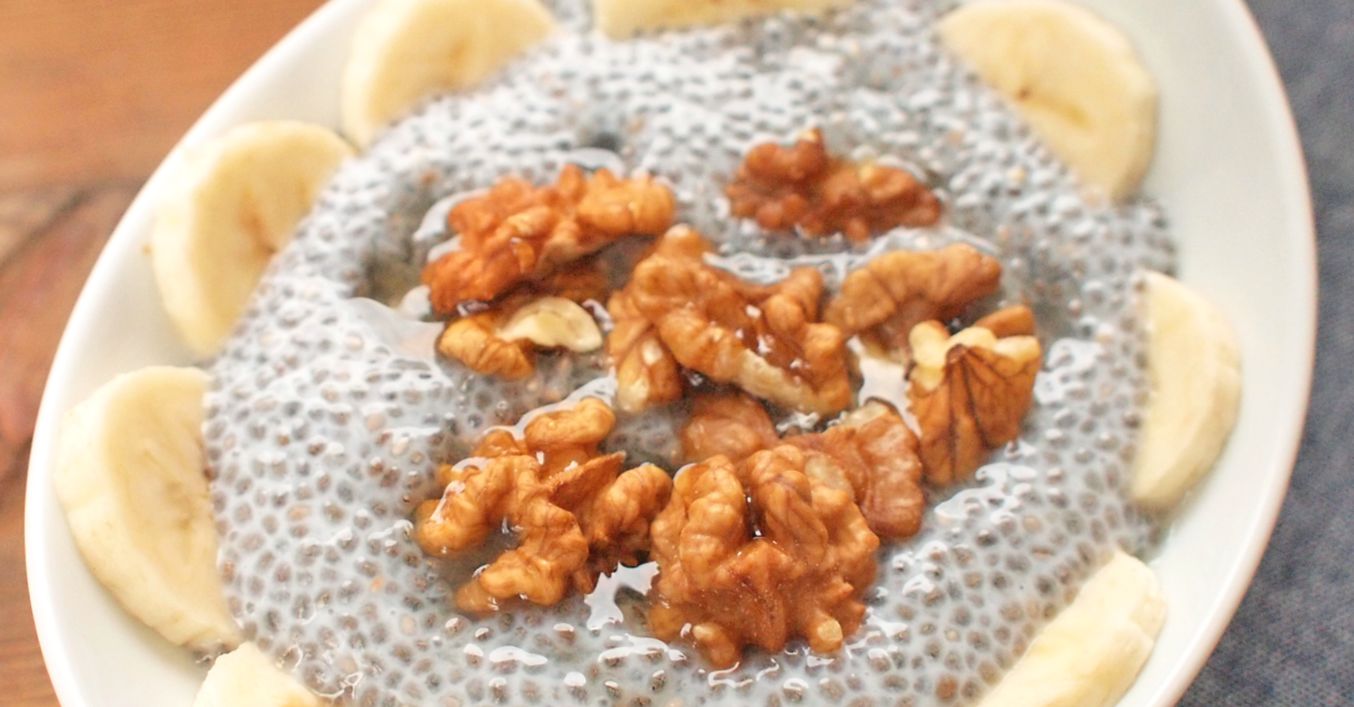 Banán oloupeme a nakrájíme na kolečka. Chia semínka osladíme agáve sirupem a dochutíme vanilkovou esencí. Rozdělíme do misek, přidáme banán a oříšky.