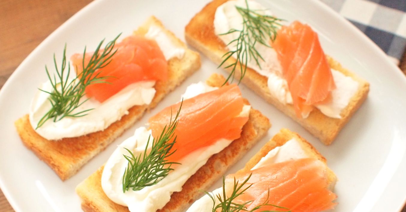 Každý toastík potřeme trochou krémového sýra, přidáme lososa a ozdobíme koprem. Ihned podáváme, aby chléb vydržel křupavý.