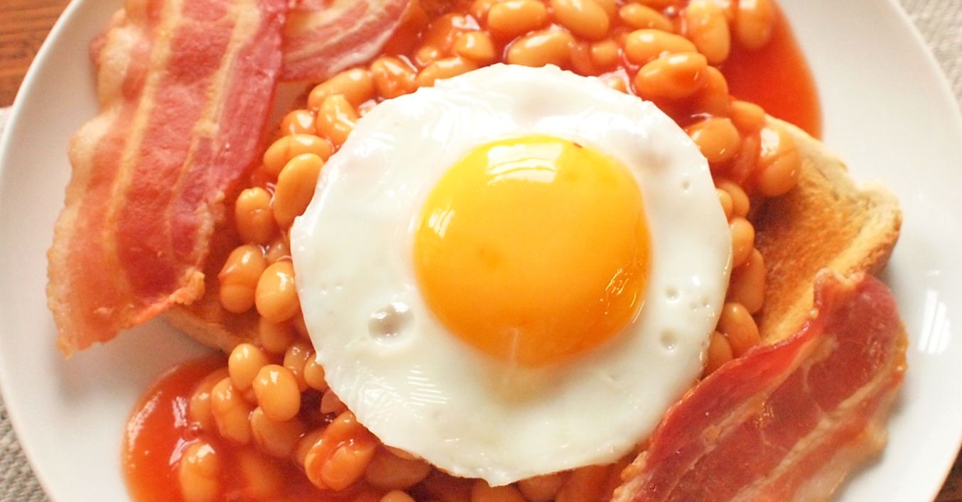 Snídaňový toast s fazolemi, slaninou a vejcem