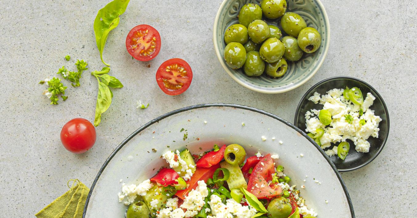 Salát podávejte s čerstvou bazalkou, nadrobeným balkánským sýrem a olivami.