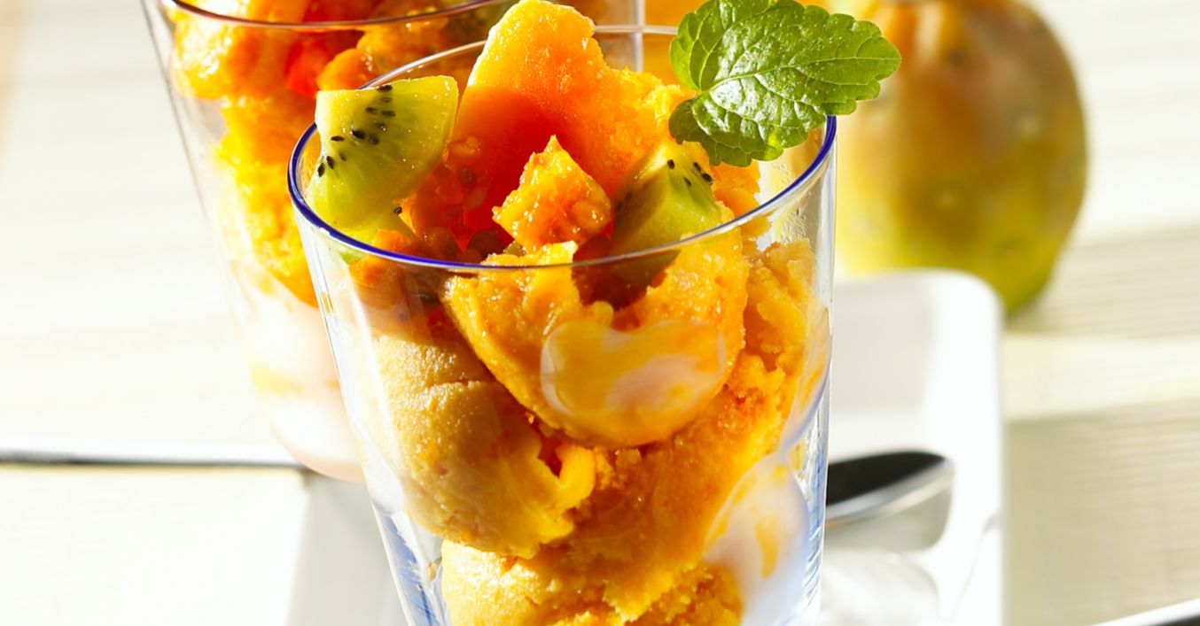 Rozmixované ovoce propasírujeme přes jemné síto. Přendáme do nádoby a dáme zmrazit do mrazáku. Zhruba co hodinu sorbet promícháme. Dohromady asi 4 až 5 hodin. Pokud máme zmrzlinovač, připravíme sorbet klasicky podle návodu.