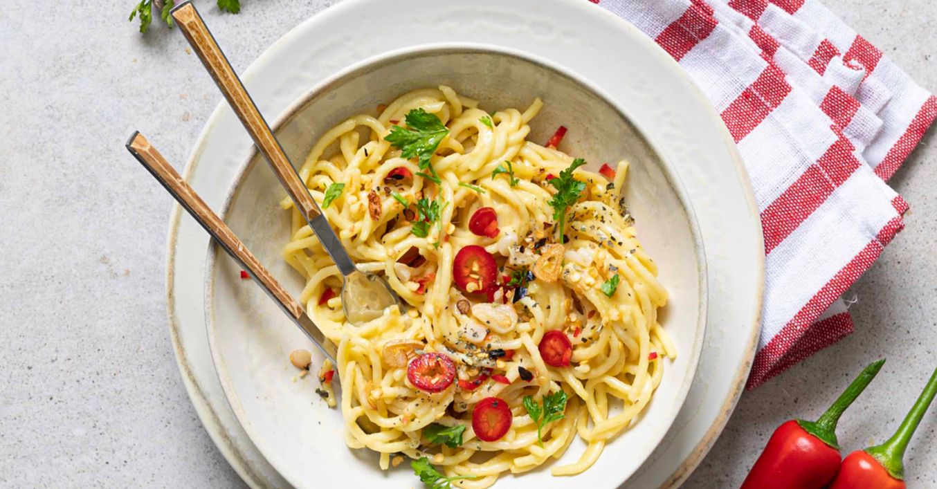 V pánvi rozehřejte olej. Orestujte plátky česneku, rajče a chilli papričku dozlatova. Pak vmíchejte špagety a čerstvou petrželku. Podle chuti osolte.