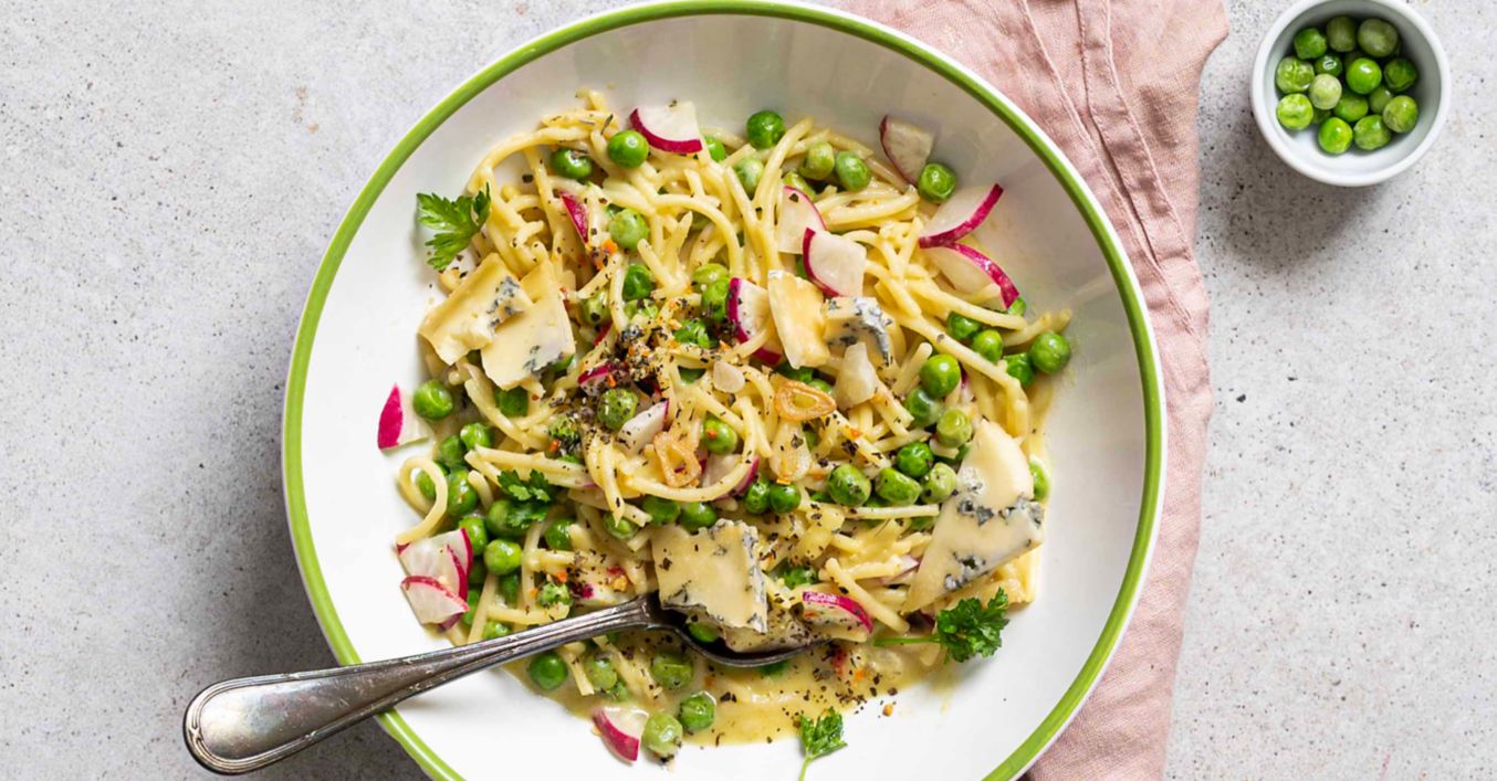 Špagety v nivové omáčce s hráškem a ředkvičkou